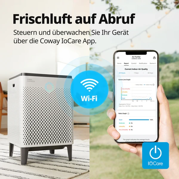 Der COWAY Airmega 300S ist die smarte Version des bewährten Airmega 300. Mit doppeltem Ansaugsystem, HyperCaptive Filtersystem und GreenHEPA Technologie entfernt er bis zu 99,999 % schädlicher Partikel aus der Luft – einschließlich Feinstaub, Allergenen, Viren und Bakterien. Durch die WLAN-Anbindung lässt er sich bequem per App steuern und überwachen, ideal für größere Räume bis 149 m².